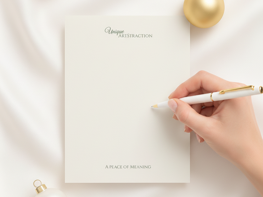 Die Rückseite jeder UniqueArtStraction-Weihnachtskarte ist bewusst pur gehalten – ein seidiges, leicht schimmerndes Papier, das wundervoll zum Beschriften ist.