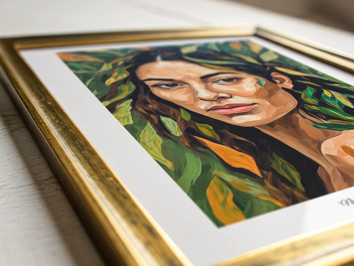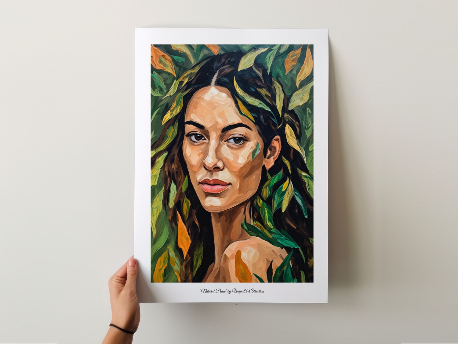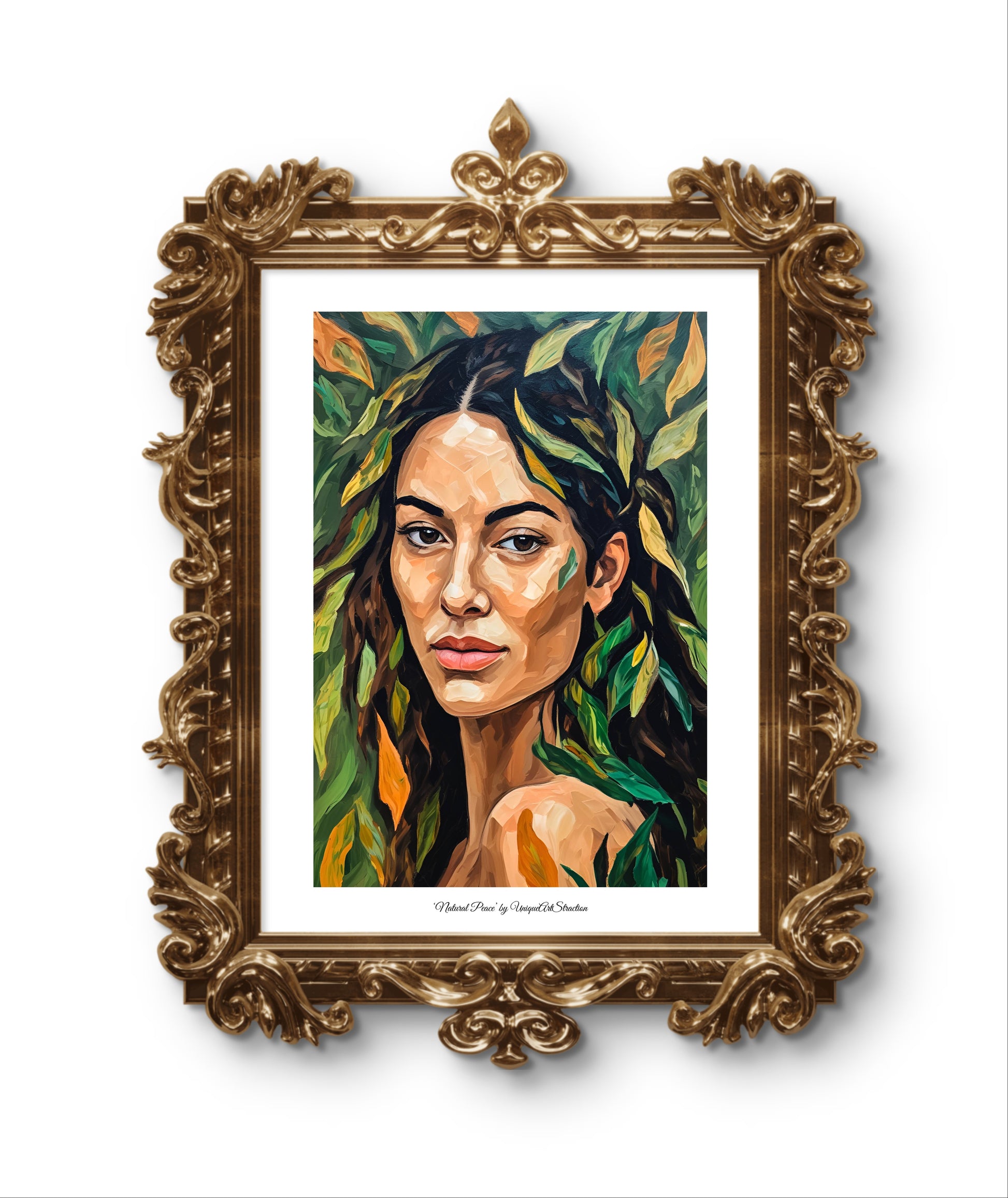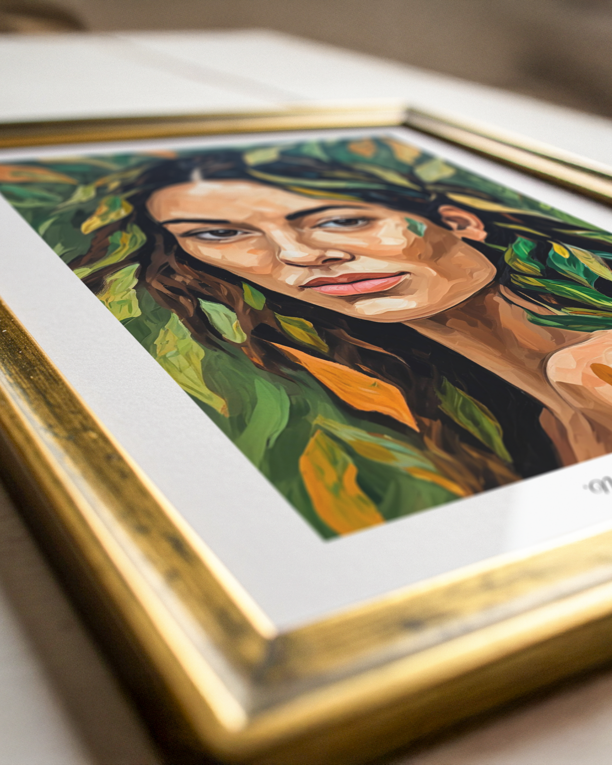 Die Frau blickt den Betrachter direkt an – selbstbewusst, verletzlich und gleichzeitig im Einklang mit der Natur, die sie umgibt. Blätter verschmelzen mit Haut und Haaren, sodass das Bild zu einem Symbol für Natürlichkeit, Authentizität und die Verbundenheit mit dem Leben wird.