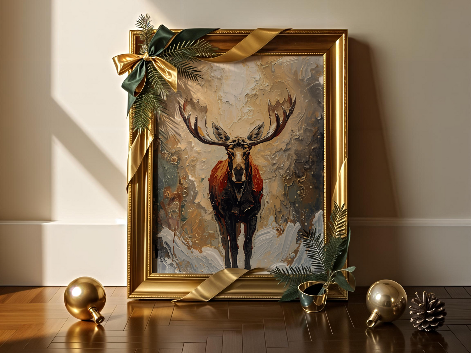 Ein praktisches Rentier in einem abstrakten Wintermeer aus Licht und Schnee. Eine Komposition aus Stille, Kälte und Anmut – poetisch und zeitlos zugleich.